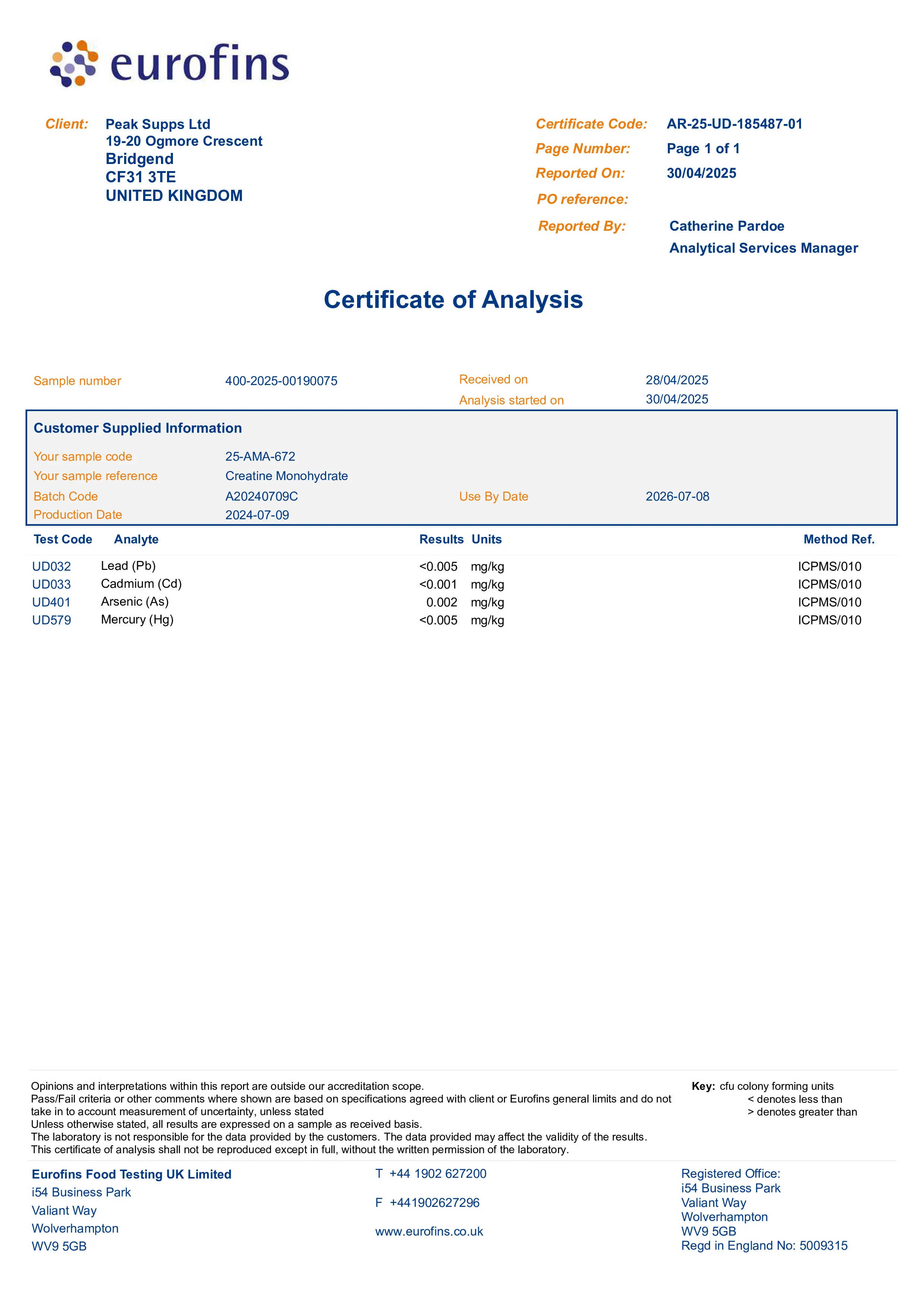 Peak Supps Creatine Monohydrate is micronized 200 mesh particle size which ensures easy mix ability and fast absorption. Our creatine powder is also available in several delicious flavours.