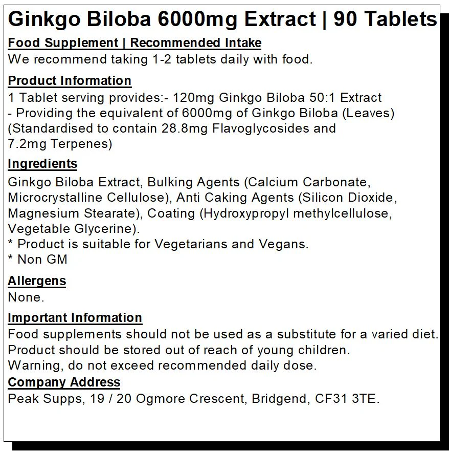 - 1 Tablet is equal to 6000mg Ginkgo Biloba leaf.