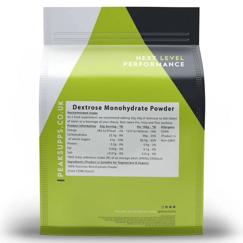 Dextrose is a simple sugar (monosaccharide) that is derived from corn starch. It acts quickly and is considered a very high glycemic index (GI) carbohydrate.